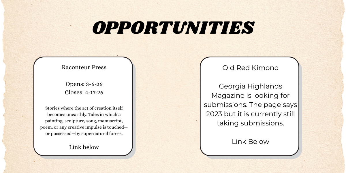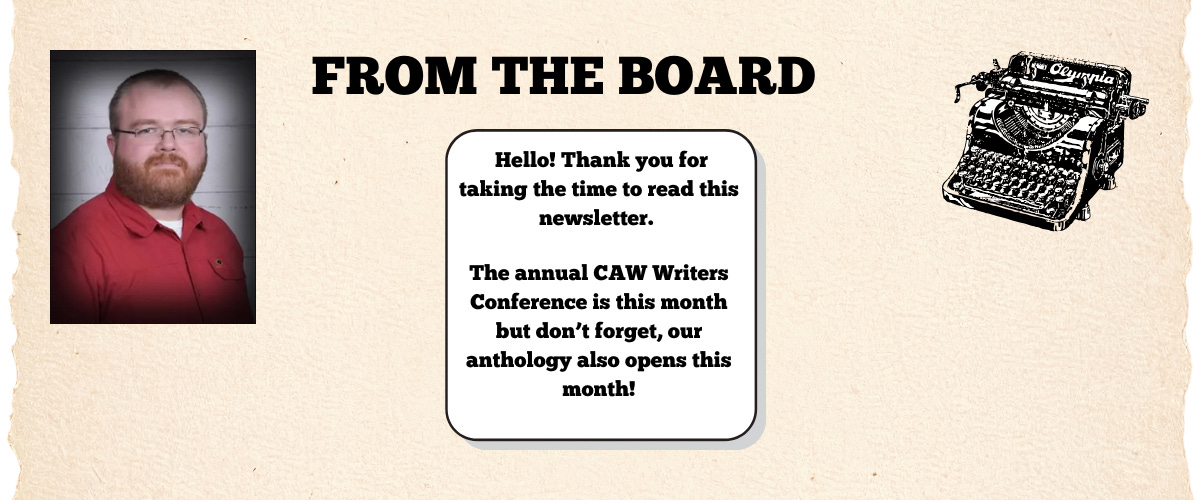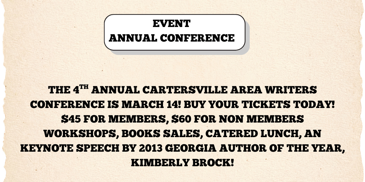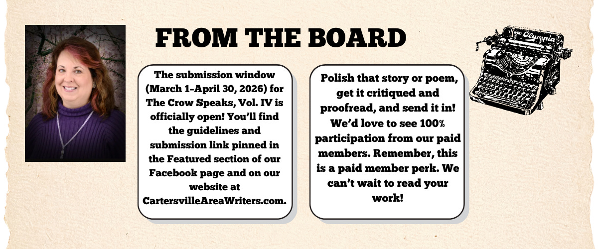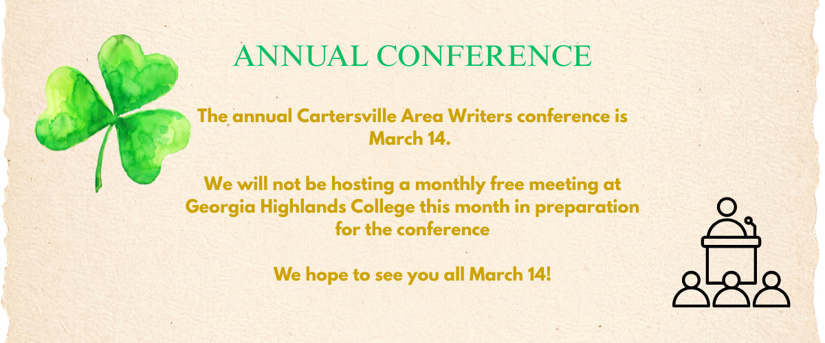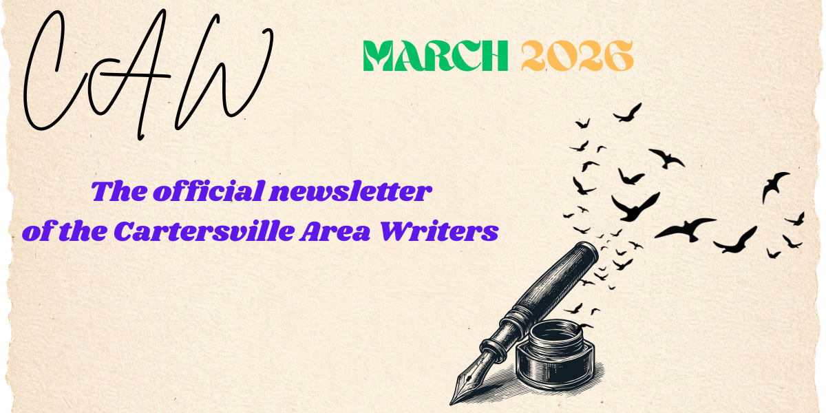 [Updated] CAW March NewsletterAnthology Season! (Updated and corrected)Cartersville Area Writers CAWMar 03, 202621ShareCAW Anthology Submission InstructionsCAW Annual Conference InformationJoin a Critique Group HereRenew or Join CAW HereFebruary Meeting on YouTubeSubscribeShareLeave a commentMessage Cartersville Area Writers CAWRaconteur Press Open Call and GuidelinesOld Red Kimono Submissions